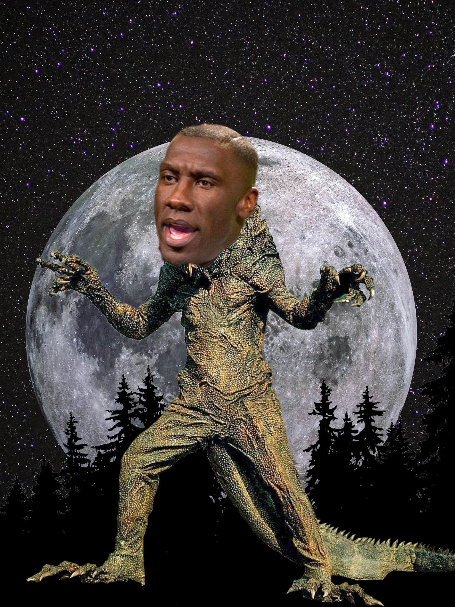 LOS ANGELES, CA— This past Tuesday night, former professional football player and current disgraced independent journalist Shannon Sharpe underwent a strange transformation when a full moon graced Los Angeles. According to reports from eyewitnesses, as the light from the full moon broke across the horizon, Sharpe’s pupils dilated intensely. His skin turned a strange, smooth green. And his penis became his tongue, which then became forked. A scent of blood permeated the air, agitating and exciting Sharpe. He followed it maniacally, muttering to himself—quiet enough to be creepy, but just loud enough to be heard—"Miss B. Nasty, Miss B. Nasty, Miss B. Nasty, mmm, mmm, mmm,” over and over, until it became an incantation of sorts.